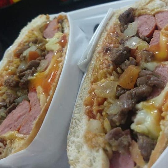 Pão, salsicha, catchup, mostarda, maionese, batata palha e calabresa