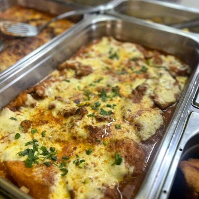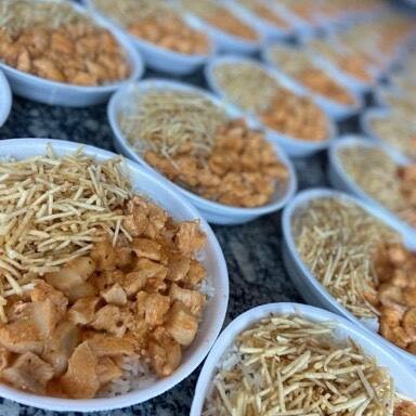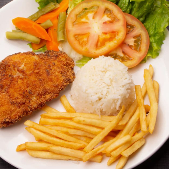 Arroz, feijão, á parmegiana de frango, batata frita e salada.