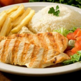 Arroz, feijão, filé de frango grelhado, batata frita e salada.