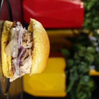 Pão,hamburguer 100g,pernil,geleia de pimenta,mussarela,molho de alho,e cebola roxa