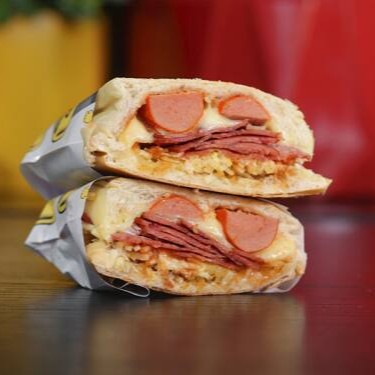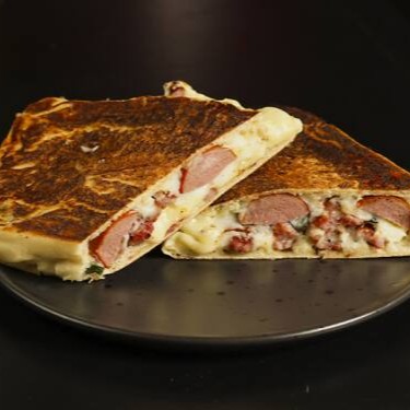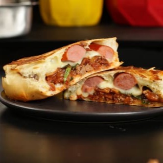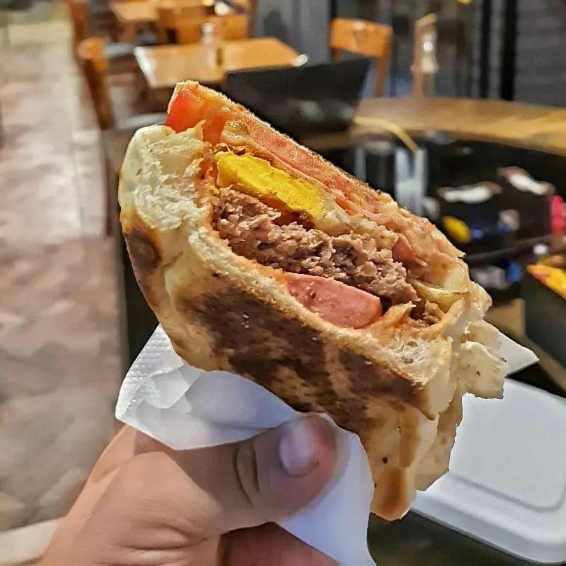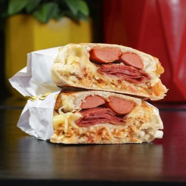 Pão,molho de tomate,salsicha,carne moida com molho de tomate,bacon,mussarela e rucula