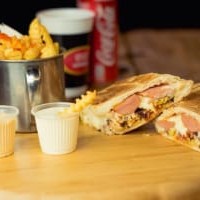 Pão,salsicha,pernil desfiado,maionese de alho,geleia de pimenta,abacaxi em cubos e cebola rocha