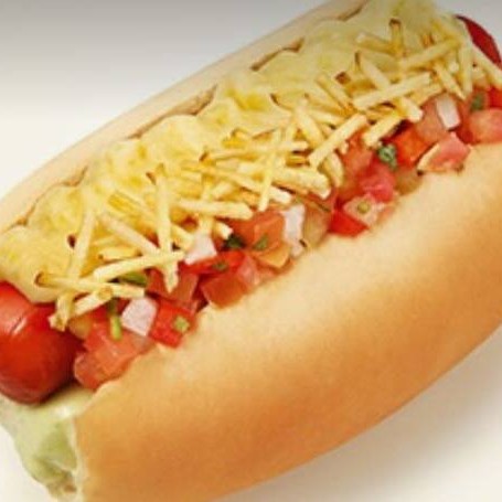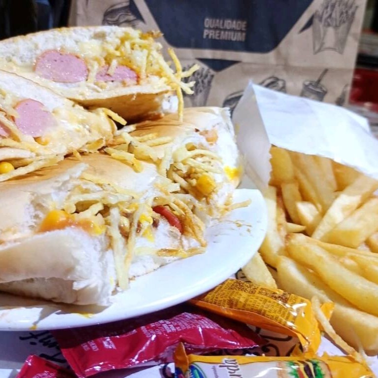Pão, 2 salsichas ao molho, purê de batata, calabresa, milho, bacon, batata palha, katchup, mostarda e maionese.
