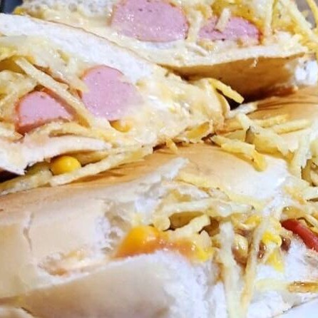 Pão, 2 salsichas ao molho, batata palha, katchup, mostarda e maionese.