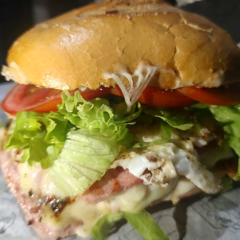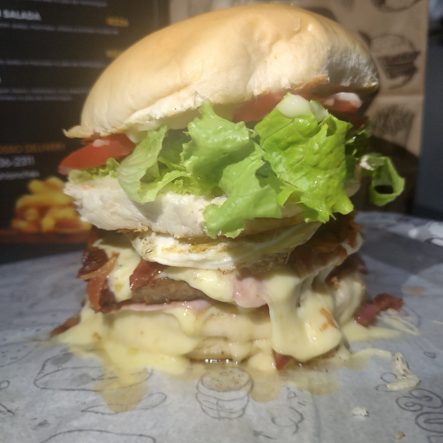 Dois hambúrgueres, mussarela, presunto, ovo, calabresa, bacon, alface, tomate e maionese caseira no pão de hamburguer.