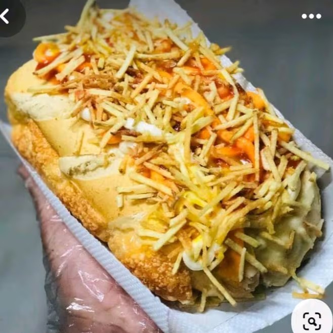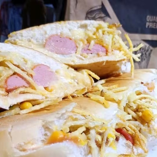 Pão, 2 salsichas ao molho, purê de batata, milho, bacon, batata palha, katchup, mostarda e maionese, prensado na chapa.