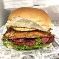 Um hamburguer, um steak de frango, queijo, presunto, calabresa, bacon, alface, tomate e maionese caseira no pão de hamburguer.
