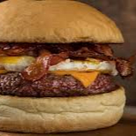 Um hamburguer, ovo, bacon, maionese caseira no pão de hamburguer.