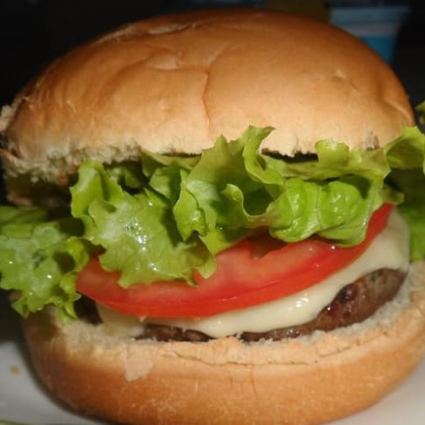 Um hambúrguer, queijo, tomate, alface e maionese no pão de hambúrguer