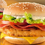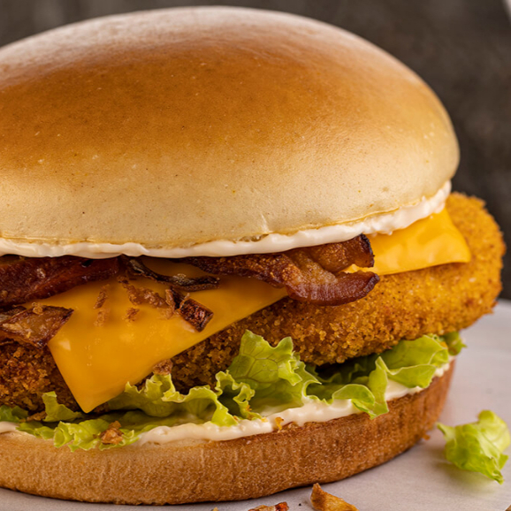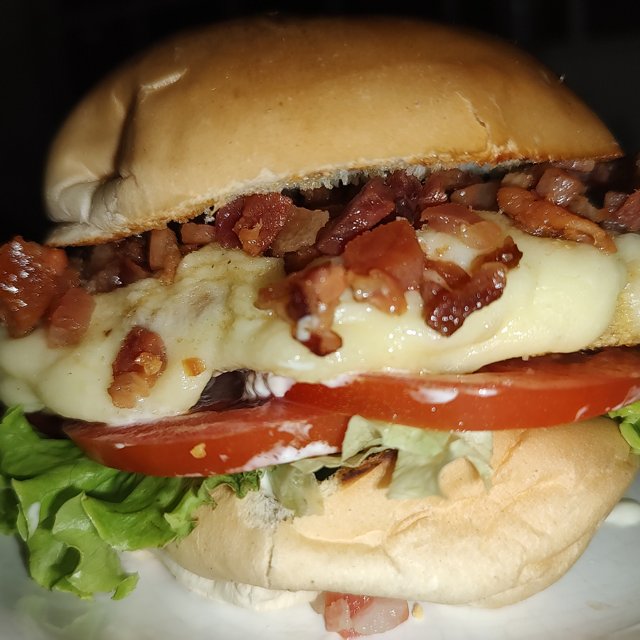 Um steak de frango, mussarela, bacon e maionese caseira no pão de hambúrguer