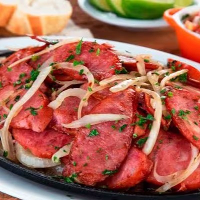 Uma Saborosa Calabresa Perdigão Acebolada, Arroz Branco, um Delicioso Feijão Bem Temperado, Um Maravilhoso Macarrão Alho e Óleo e Farofa.