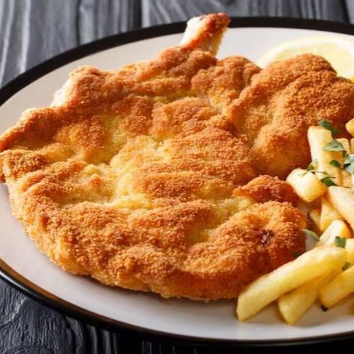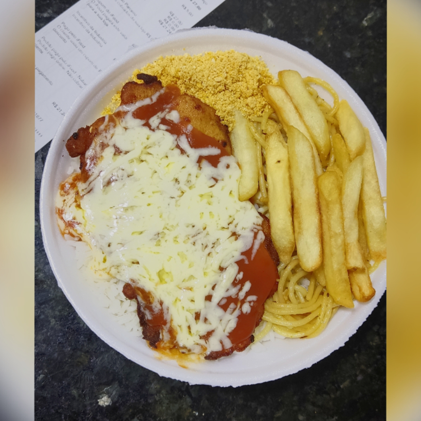 Um Saboroso Filé de Frango a Parmegiana, Arroz Branco, Feijão Bem Temperado, Batata Frita, Delicioso Macarrão Alho e Óleo e Farofa.