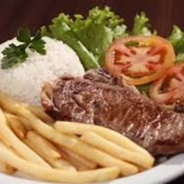Arroz soltinho acompanhado de feijão bem temperado, contra filé grelhado no ponto certo, macio e suculento, servido com uma porção de batatas fritas douradas e crocantes, formando uma refeição completa, clássica e cheia de sabor.