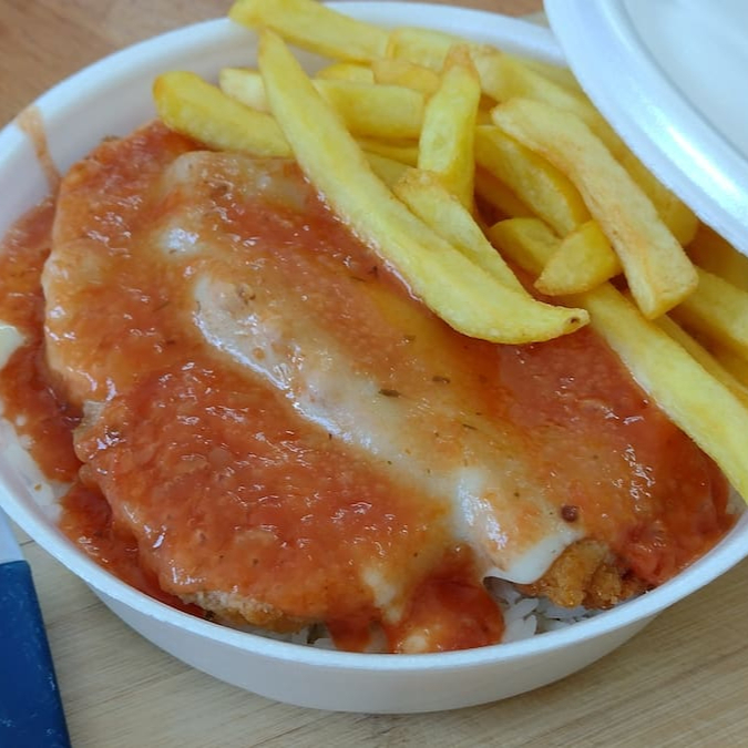 Esta marmitex acompanha arroz, feijão, parmegiana de frango com molho e mussarela e fritas!
