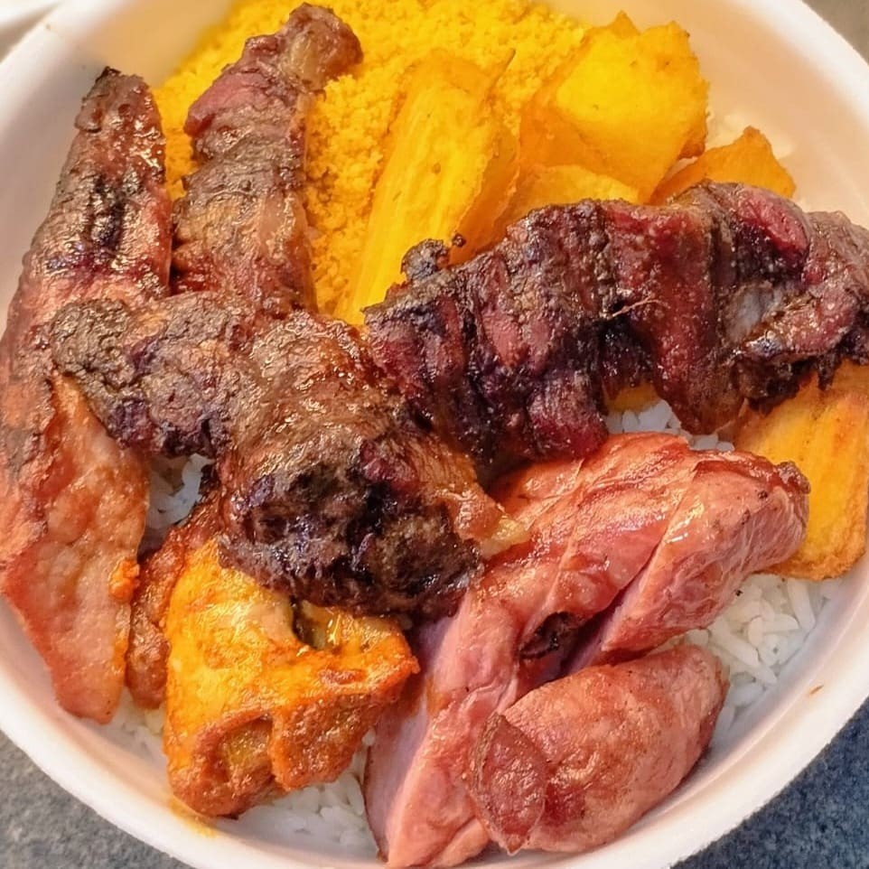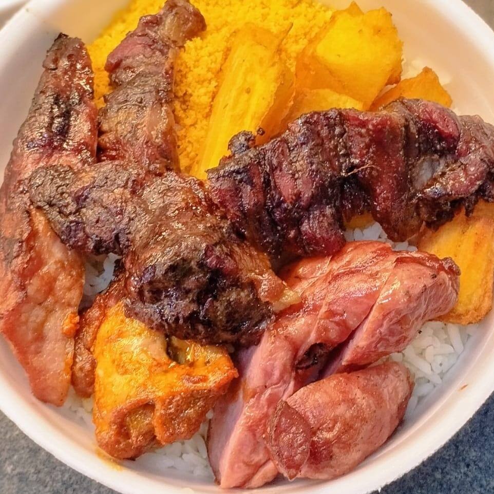 A Churrascaria Boi Branco traz para você a opção de 'Marmita Churrasco na Brasa'. Esta delícia é composta por suculentos pedaços de carne cuidadosamente selados na brasa, fraldinha linguiça Toscana tender e frango assado acompanhados de um arroz branco leve e soltinho, um feijão carioca bem temperado e com gostinho de casa, uma farofa crocante e saborosa e fritura na medida certa. Como toque final, sempre fresca e variada. Servimos este prato caseiro e repleto de sabor no almoço. O tamanho da marmita é médio, perfeito para satisfazer o seu apetite. Venha experimentar!