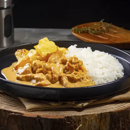 A Churrascaria Boi Branco tem o prazer de apresentar a 'Marmita média de strogonoff de frango, um prato de destaque na nossa linha de Marmita Tradicionais. Este prato irresistível é composto por pedaços de frango em cubos suculentos, cuidadosamente selados e banhados por um autêntico e saboroso molho. Acompanhando esta delícia, temos um arroz branco leve e soltinho, um feijão carioca bem temperado que remete ao sabor caseiro autêntico, uma farofa crocante , e uma porção de fritas, perfeitamente douradas e batata palha. Este prato é servido no almoço, em uma marmita de tamanho médio, perfeita para satisfazer o seu apetite de forma completa e deliciosa. Venha se deliciar com essa tentação da culinária brasileira!