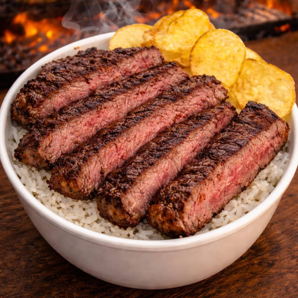 A Churrascaria Boi Branco apresenta a 'Marmita Média de Fraldinha na Brasa', uma opção irresistível para os amantes de carne. Esta delícia é composta por suculentos pedaços de fraldinha, meticulosamente selados na brasa, garantindo um sabor intenso e único. Acompanha um arroz branco leve e soltinho, um feijão carioca temperado à perfeição, imprimindo um gostinho caseiro, uma farofa crocante e saborosa e fritura , dourada no ponto ideal.