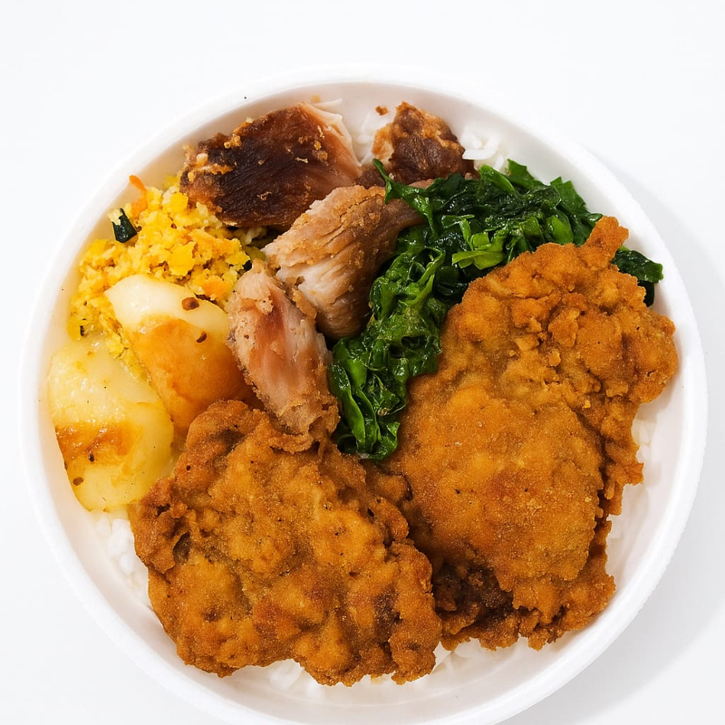 Feijão,arroz,filé de frango a milanesa,cenoura com repolho refogado e farofa.
