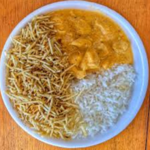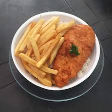 arroz ,frango frito ao molho e queijo gratinado, acompanhado de batata frita