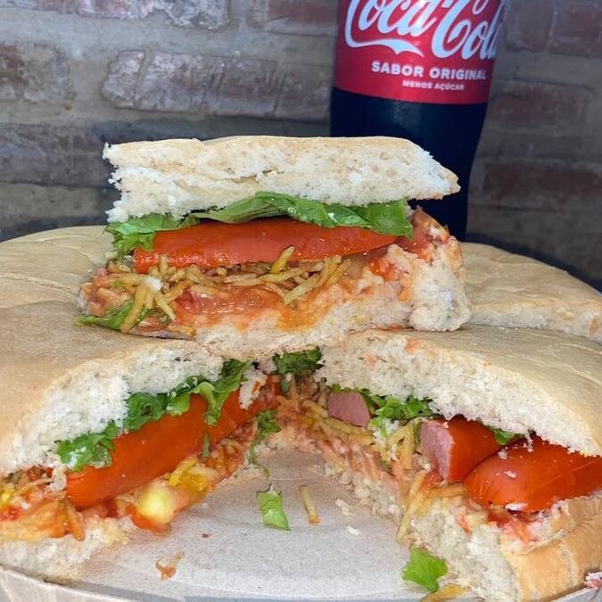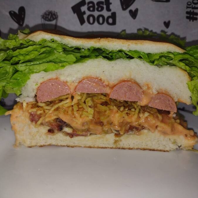 (Delicioso Lanche com Salsichas, batata palha, vinagrete, milho, bacon, calabresa, queijo, presunto, catchup, mostarda, maionese)