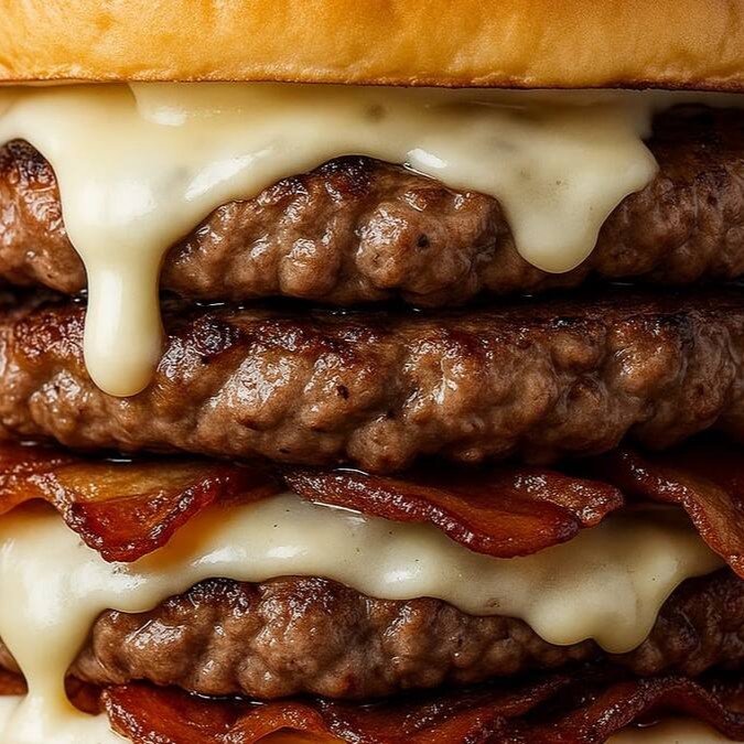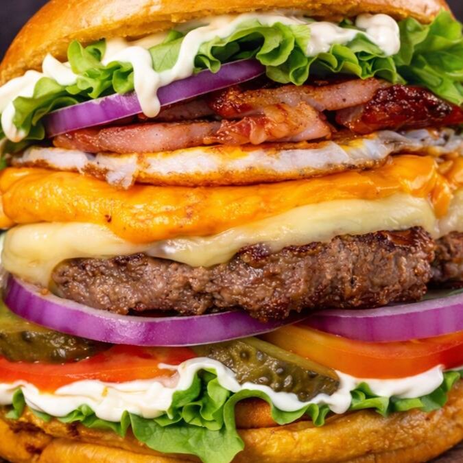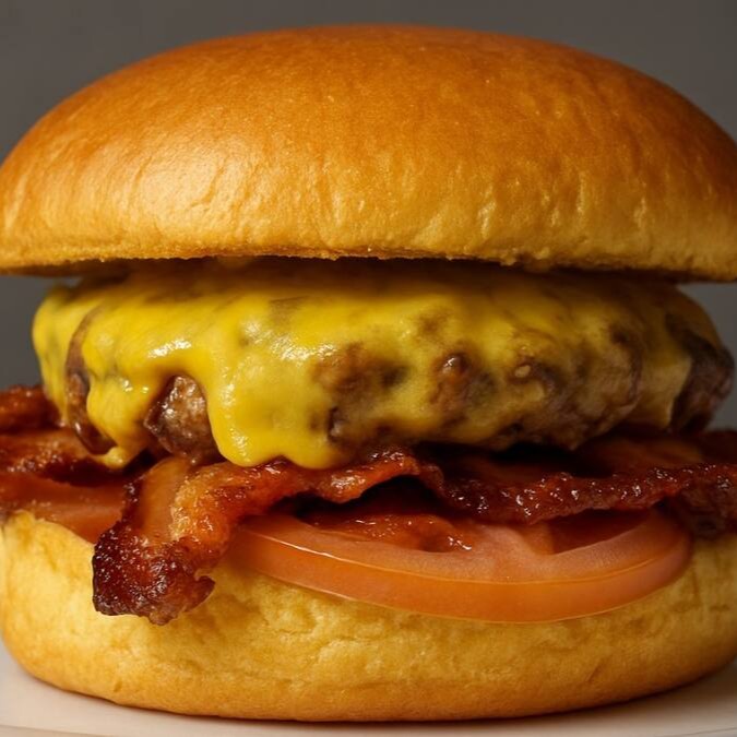 (Delicioso Lanche com Hambúrguer, queijo, bacon, tomate e maionese)