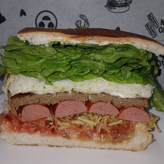 (Delicioso Lanche com Hambúrguer, salsicha, vinagrete, batata palha, catchup, mostarda, maionese e alface)