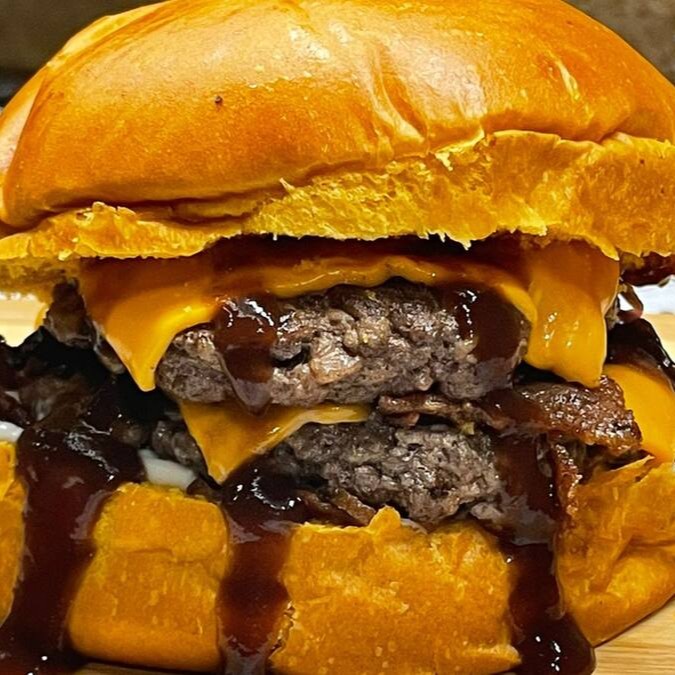 Lanche espetacular com Pão de brioche, maionese da casa, 2 hambúrguer 150g, bacon, queijo cheddar, molho barbecue, bacon