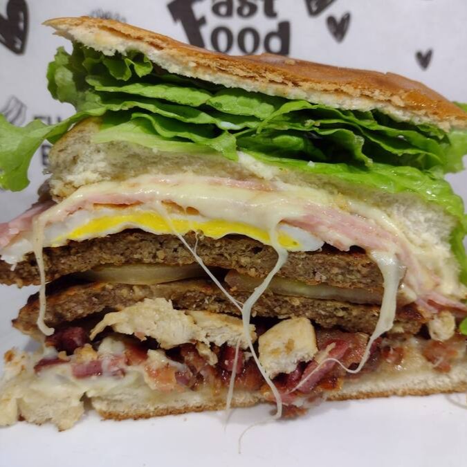 (saboroso Lanche com 2 Hambúrguer, filé de frango, 4 fatias de queijo, 4 fatias de presunto, ovo, bacon, calabresa, Catupiry, tomate, alface)