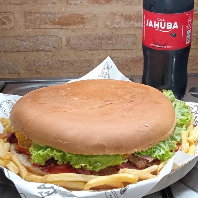 Combo acompanha : 1 Lanche tamanho familia (Hamburguer, Catchup, maionese, Queijo Mussarela, Bacon e Tomate), 400g de Fritas crocantes e 1 Jahuba 2 litros (sabores variados)