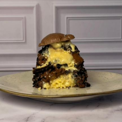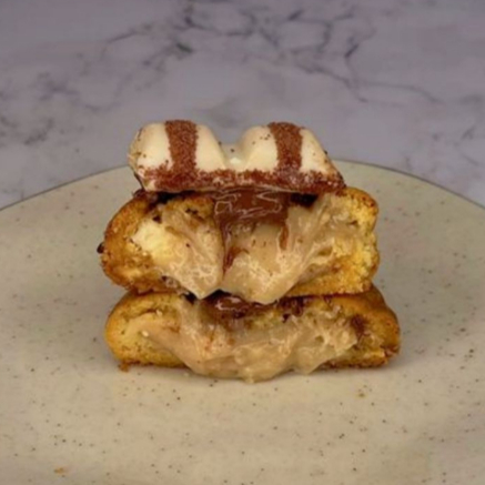 Inspirado no Kinder Bueno, é feito com nossa exclusiva massa de manteiga noisette, lascas de chocolate nobre branco e ao leite, recheio feito com nosso creme de Kinder (chocolate branco, pasta de avelã e Kinder bueno), acompanha Kinder bueno por cima. Peso: 120g. Grau de doçura: 5/5