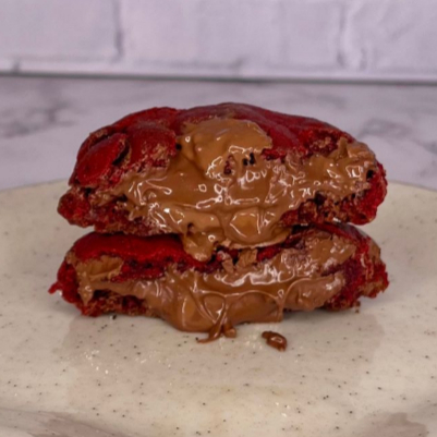 Nosso cookie Red Nutella é feito com a clássica massa Red Velvet com cacau e baunilha que deixa o cookie super úmido, gotas de chocolate ao leite e recheado com autêntica Nutella! Peso: 110g Grau de doçura: 3/5.