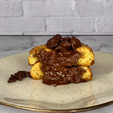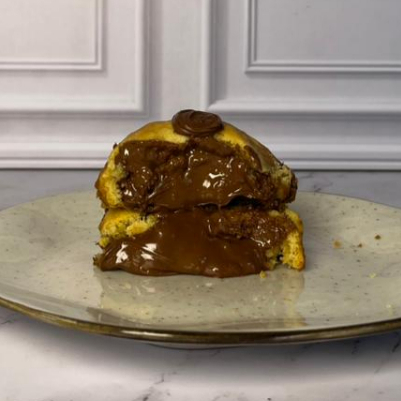 Irresistível massa de manteiga noisette (manteiga com notas de caramelo e amêndoas) lascas de chocolate nobre ao leite, absurdamente recheado com a autêntica Nutella, perfeito para os amantes de Nutella. Peso: 110g. Grau de doçura: 4/5