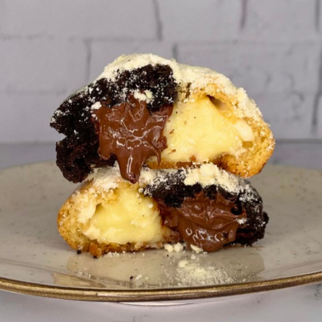 O clássico sabor Ninho com Nutella mas em uma versão nada clássica! Nosso cookie tem metade da massa de baunilha com gotas de chocolate branco e recheio de brigadeiro de Ninho e metade da massa de cacau com gotas de chocolate ao leite e recheio de Nutella! Você pode escolher entre comer os dois separados ou juntar o melhor dos dois mundos. Peso: 110g. Grau de doçura: 5/5