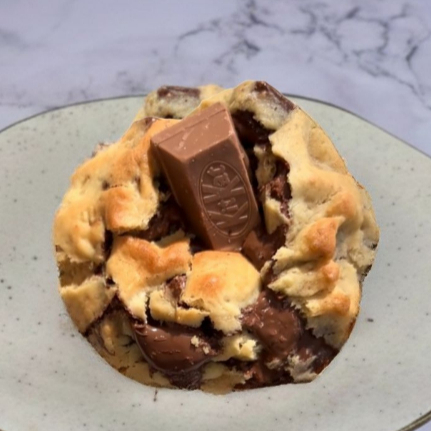 Massa de manteiga noisette, que traz aquele leve toque caramelizado. Recheado com chocolate ao leite cremoso com KitKat picado. Finalizado com KitKat por cima. Muito chocolatudo e suuuper crocante. Cookie Maior que os tadicionais, com 130g.