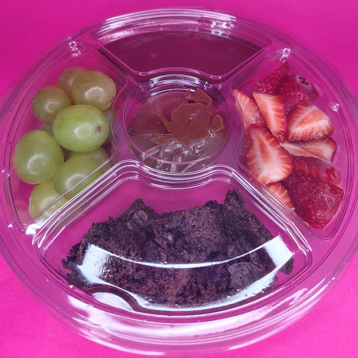 Uva verde, morangos, brownie, creme de avelã e ganache