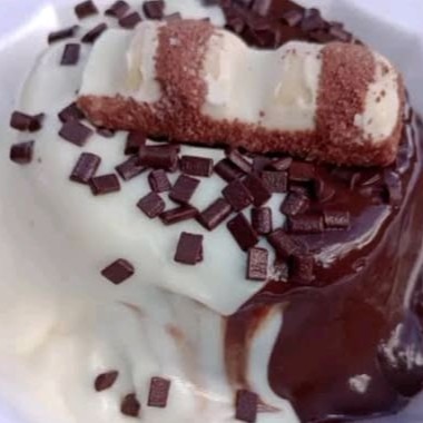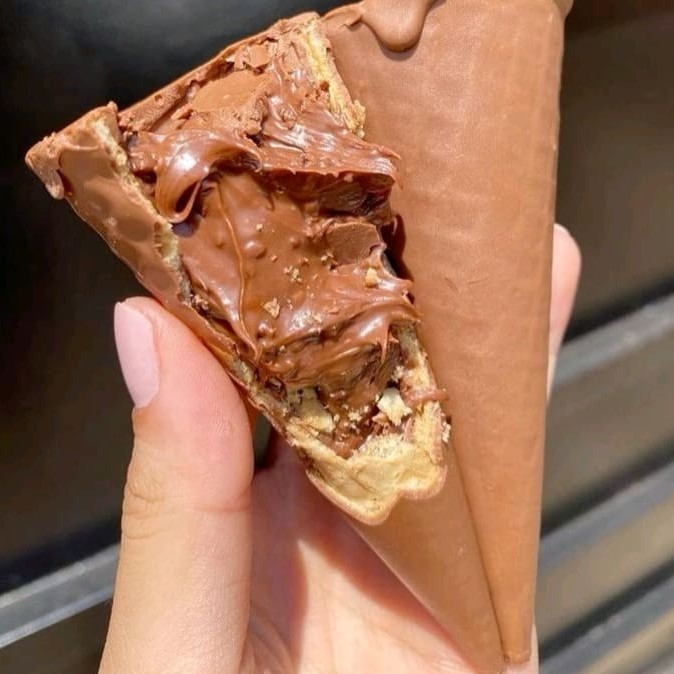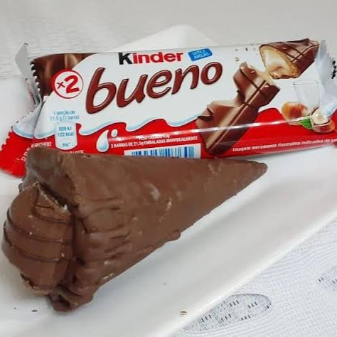 Casquinha de sorvete banhada em chocolate, com recheio sabor Kinder Bueno e finalizado com um pedaço de Kinder Bueno em cima a