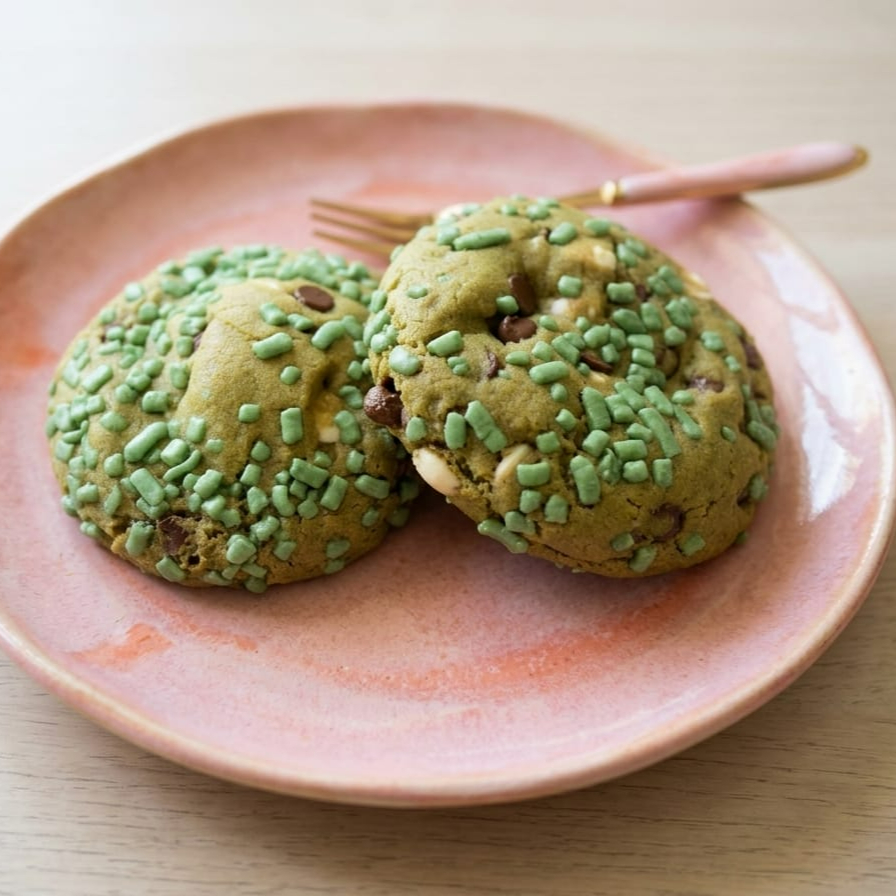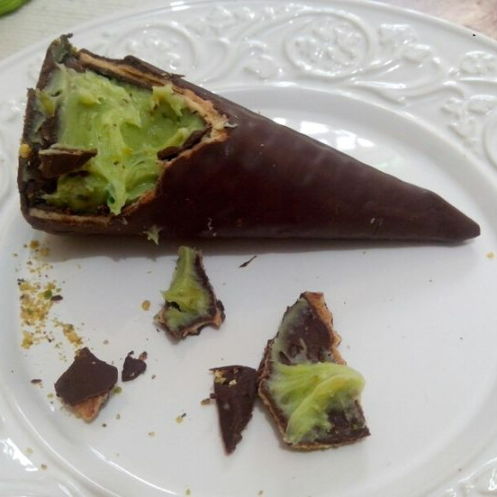 Massa tradicional com gotas de chocolate misturados e recheio de pistache