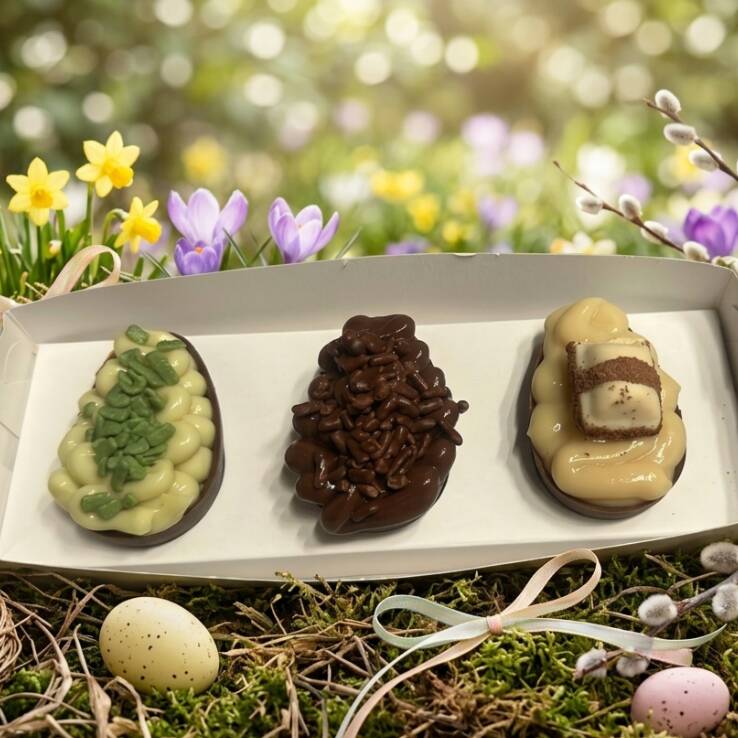 Trio de Mini Ovinhos de páscoa, sabores de; pistache, creme de avelã e Kinder Bueno