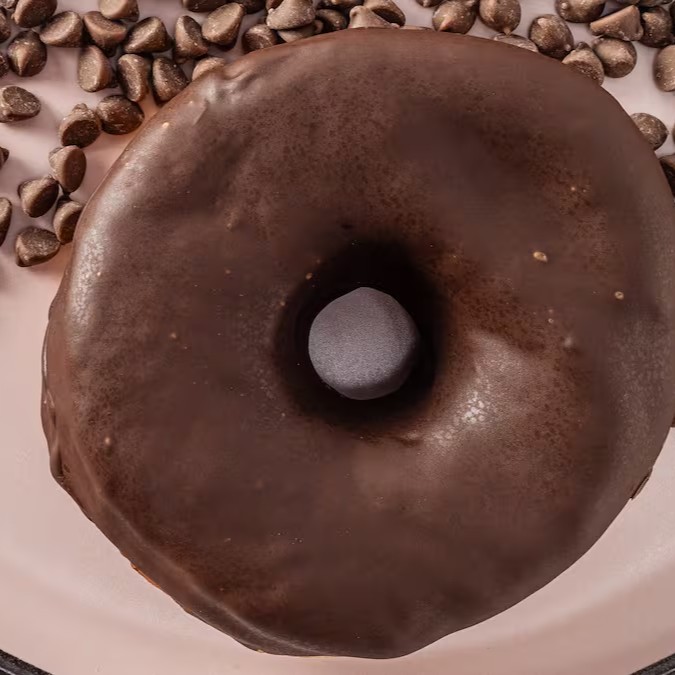Donut com cobertura de chocolate meio amargo. Sem recheio.