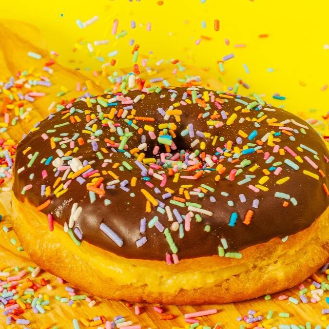 Donut recheado de creme de baunilha com cobertura de chocolate e granulado colorido.
