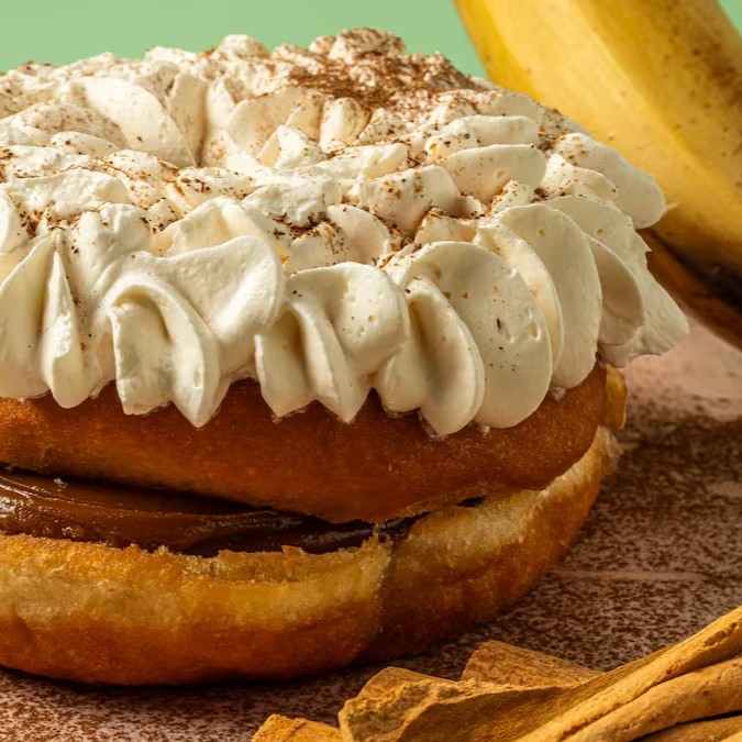 Donut recheado com doce de leite e banana picadinha com cobertura de chantilly polvilhada de canela. Gostinho de banoffee em forma Donuts!