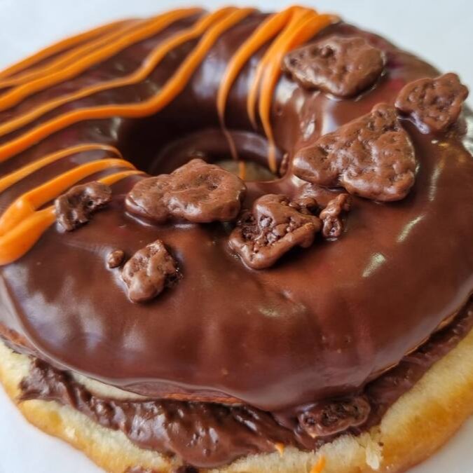 Donut recheado com Creme Crocante de Ovomaltine com cobertura de chocolate e Ovomaltine Rocks.