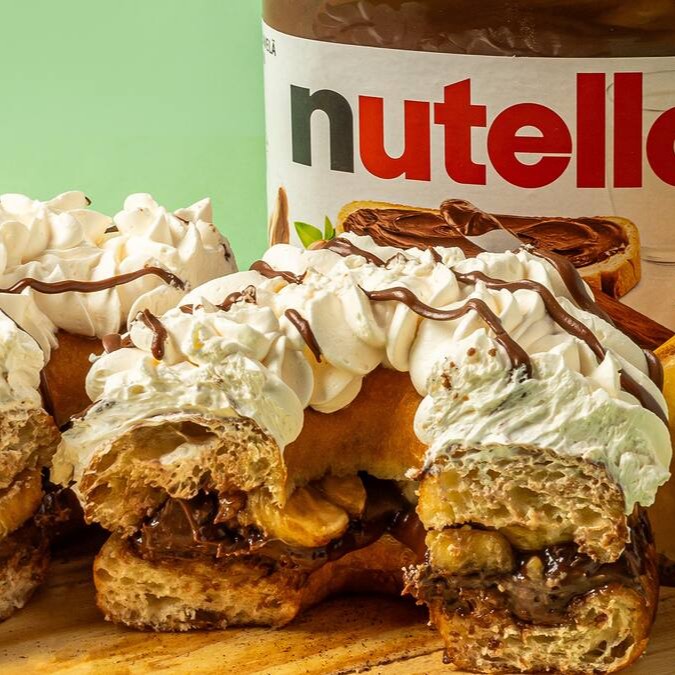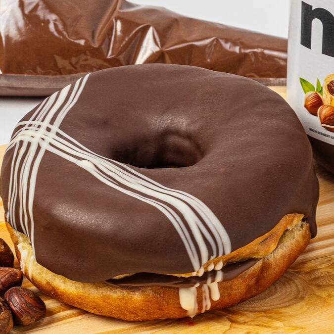 Recheado da combinação perfeita brigadeiro de leite Ninho + Nutella com cobertura de chocolate branco, fios de Nutella e leite Ninho polvilhado.