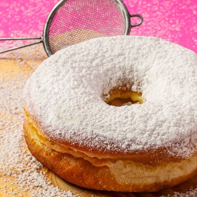 Donut recheado com creme de baunilha com cobertura de açúcar de confeiteiro.