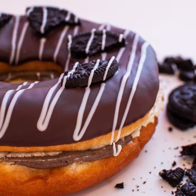 Donut recheado de brigadeiro de Oreo com cobertura de chocolate, um Oreo e fios de chocolate branco.