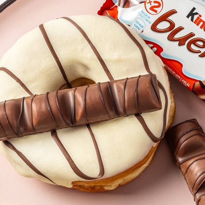 Donut recheado de brigadeiro Kinder com cobertura de chocolate branco, fios de Nutella e uma barrinha Kinder Bueno todinha para você!