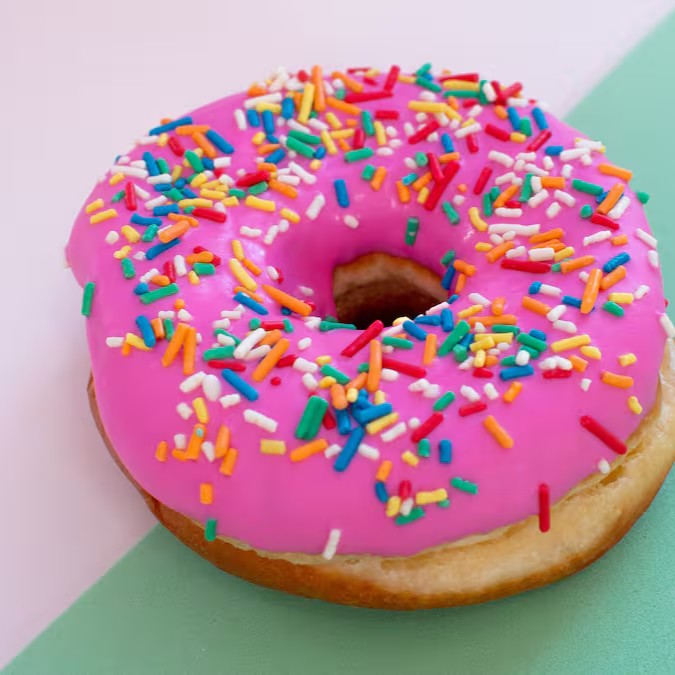 Donut com cobertura rosa (base de chocolate branco) e granulado colorido. Sem recheio.