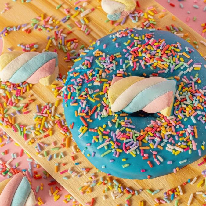 Donut com cobertura azul (base de chocolate branco), granulados coloridos e um marshmallow. Sem recheio.