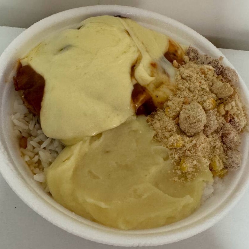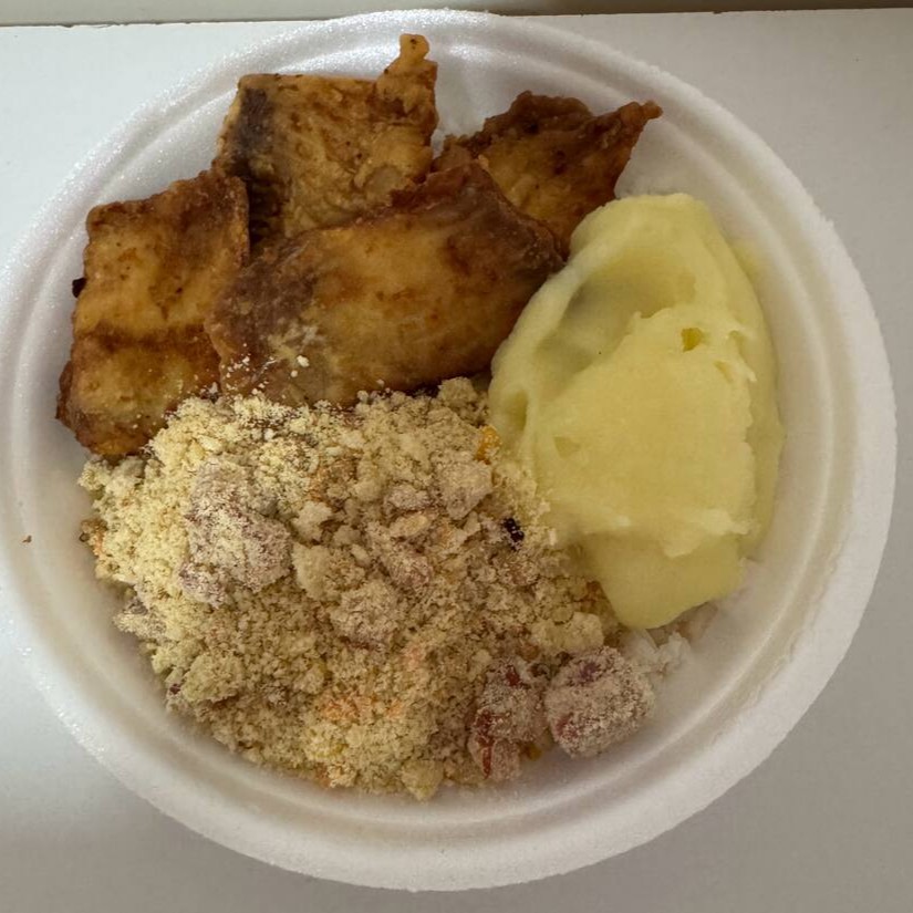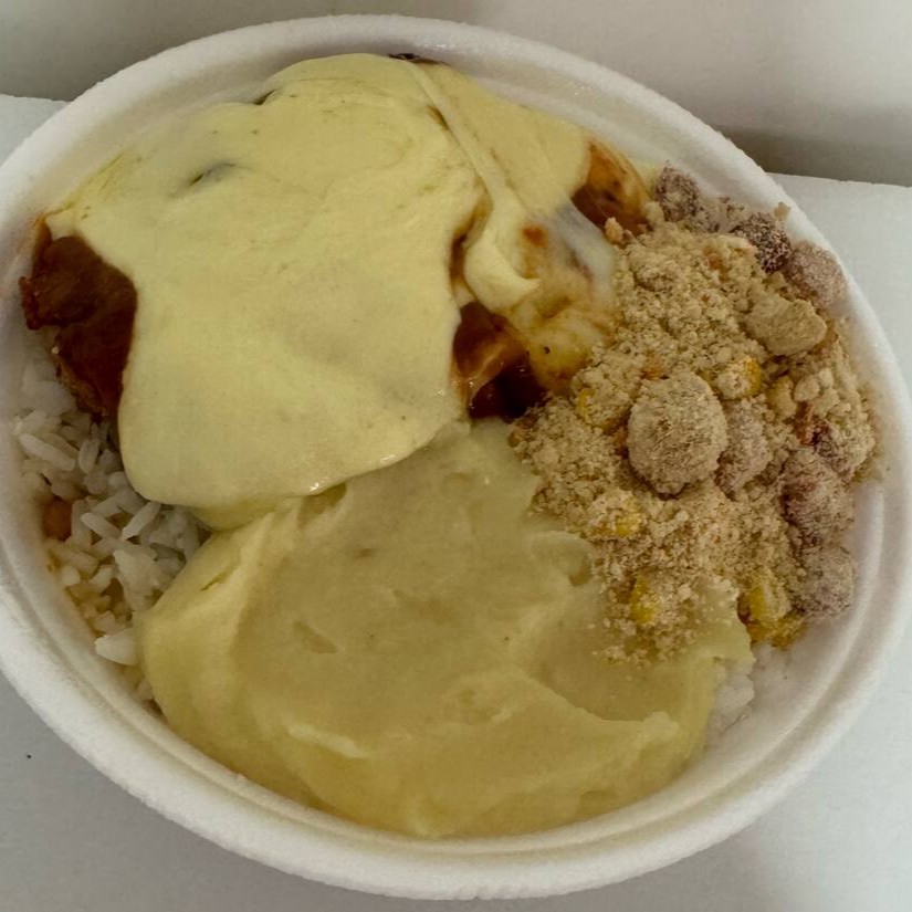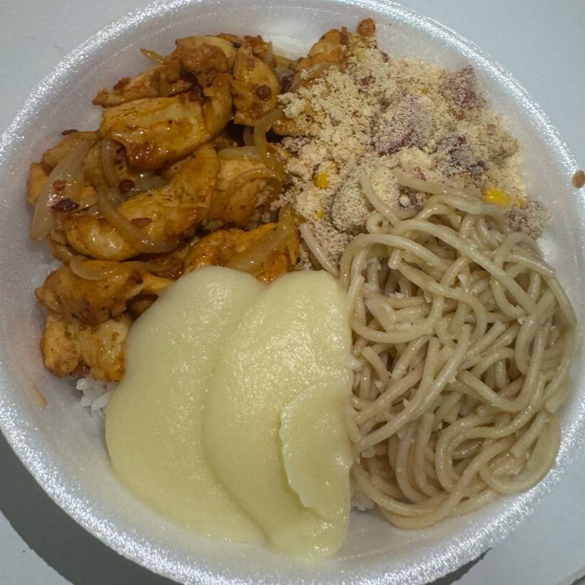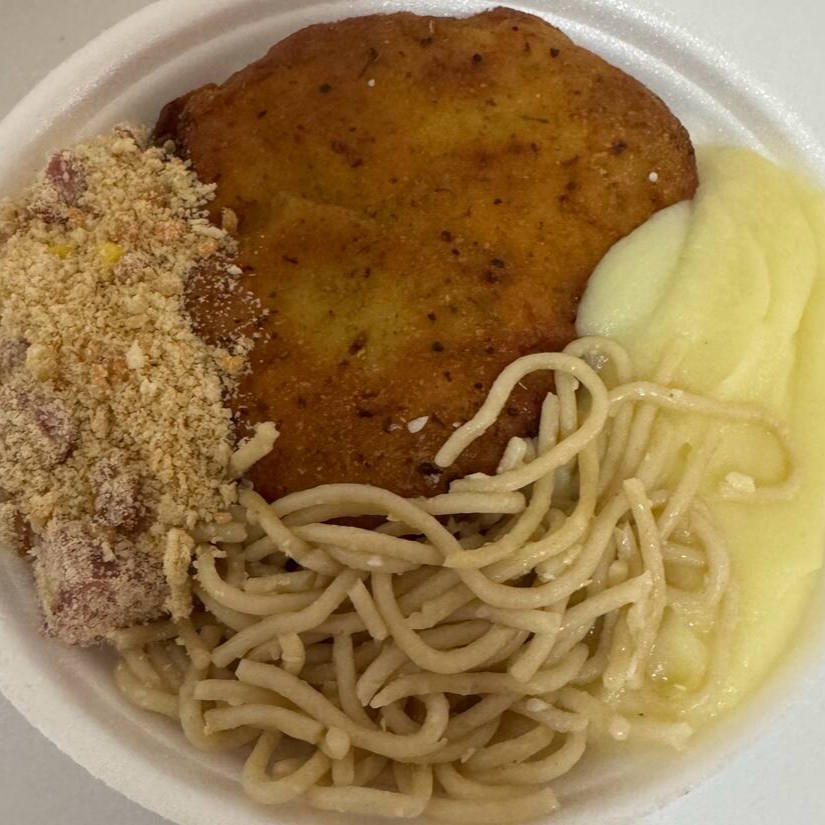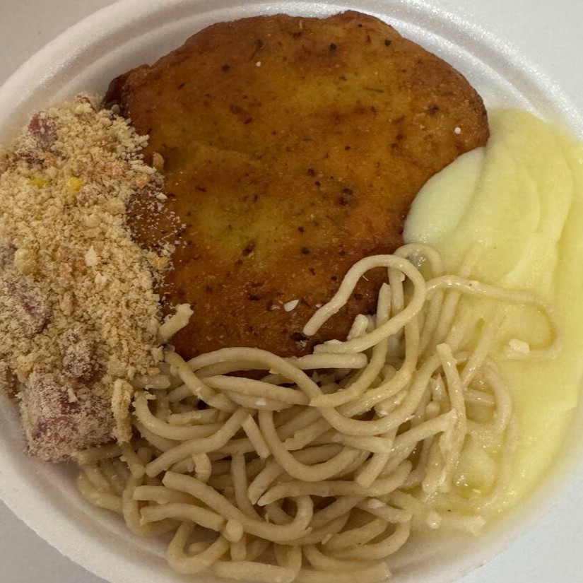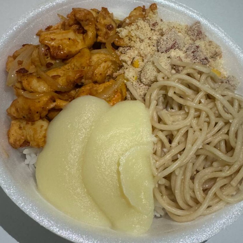 Acompanha arroz, feijão temperado, farofa crocante, macarrão alho e óleo e puré de batata cremoso.