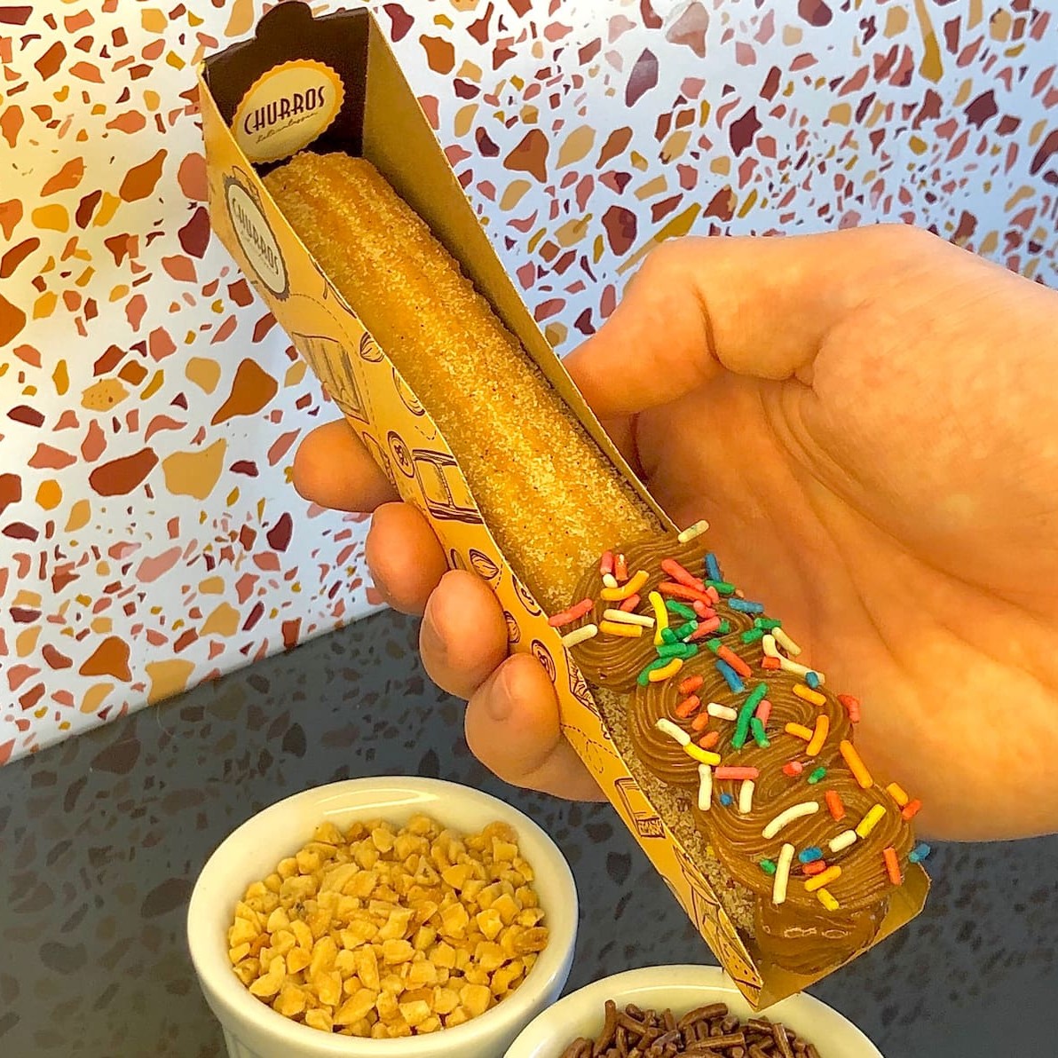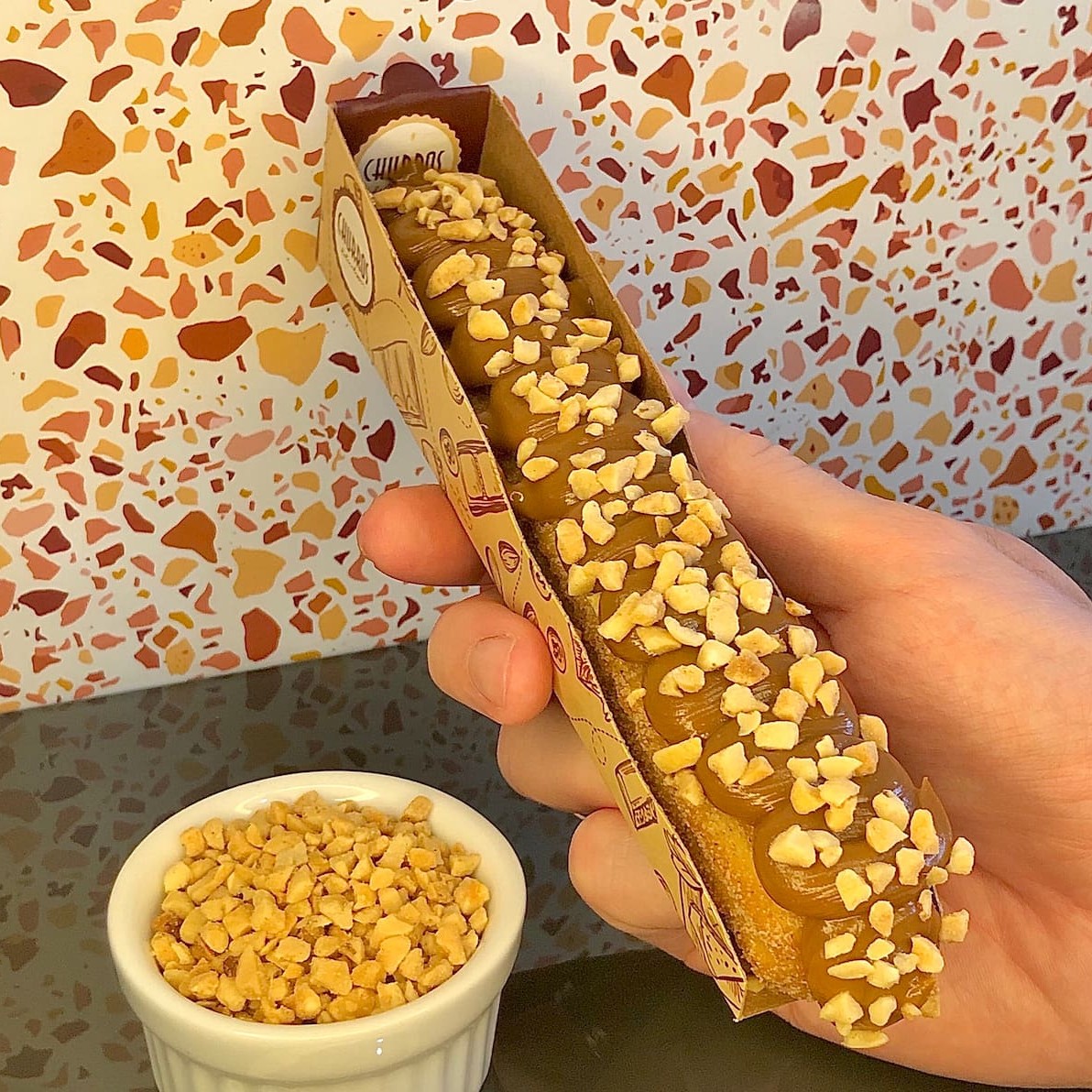Churros tradicional deitado, com cobertura cremosa de doce de leite. Aproximadamente 16cm - serve 1 pessoa!